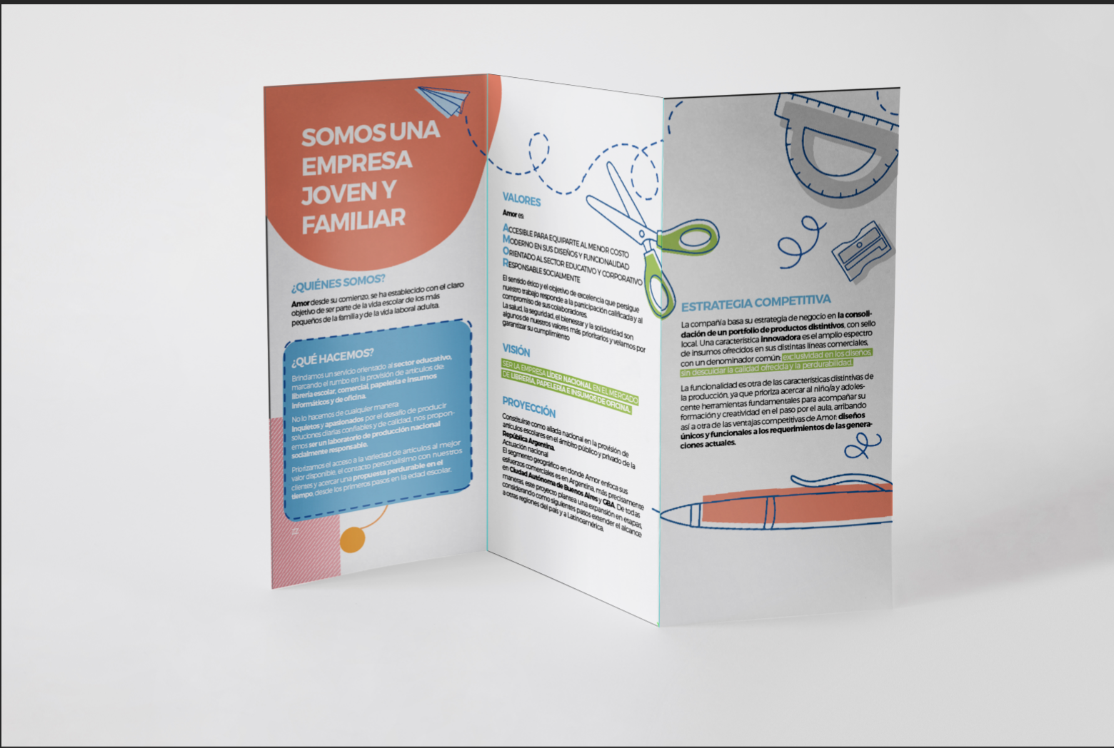 En el recorrido realizado junto a la pyme Amor de útiles escolares, se decidió trabajar fuertemente la identidad marcaria, recogiendo la tradición familiar en la que se inscribe la empresa y generando una conceptualización moderna, joven y comprometida socialmente.